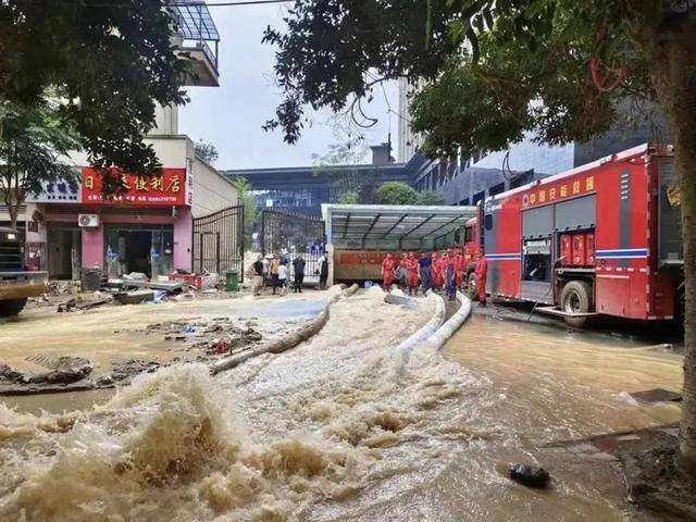 国家危险化学品应急救援贵州磷化队、中国安能贵阳基地等4支国家应急救援队出动大流量排水抢险车到滨江花园居民小区、常驰广场、商场等多个洪涝严重区域开展排涝作业。