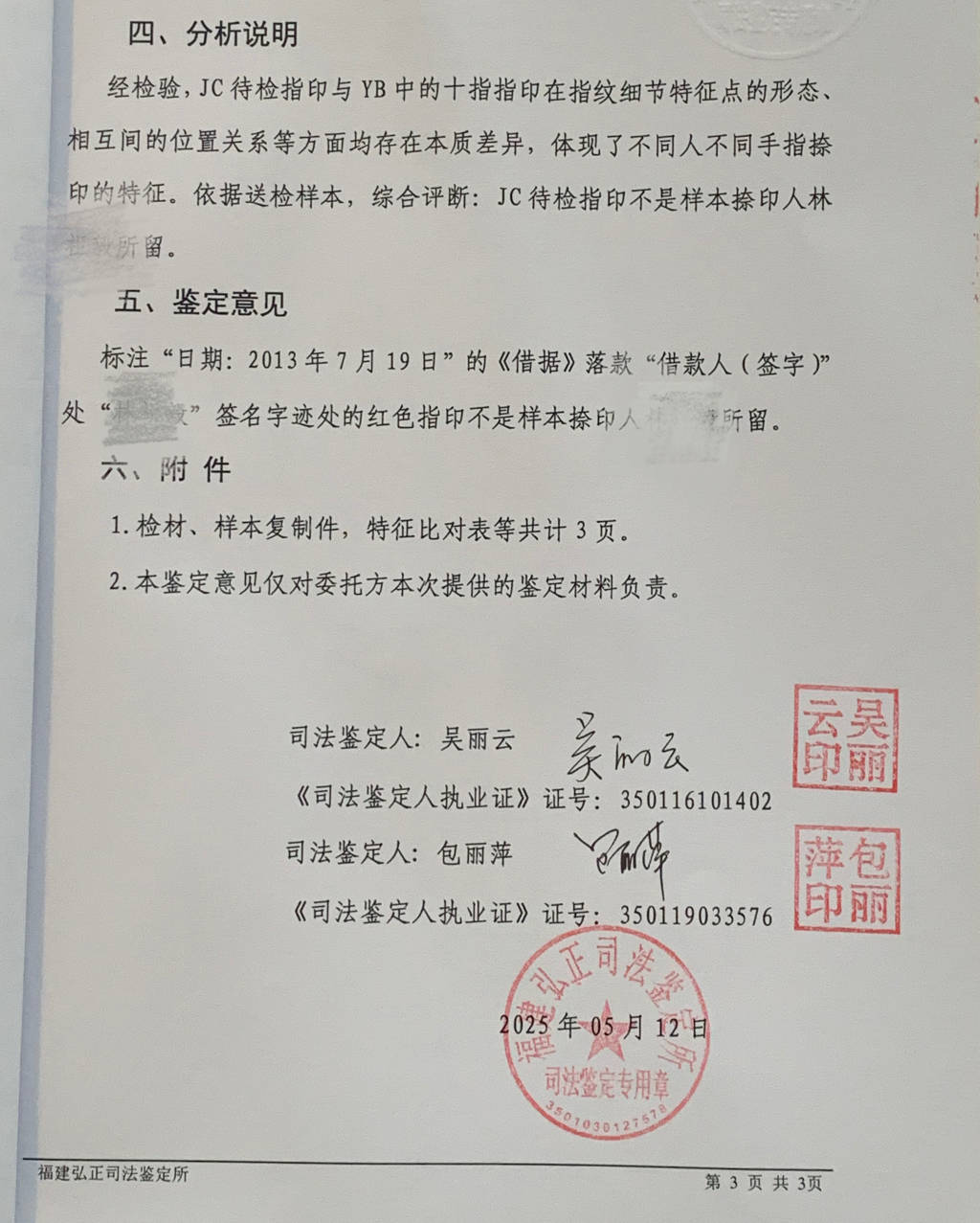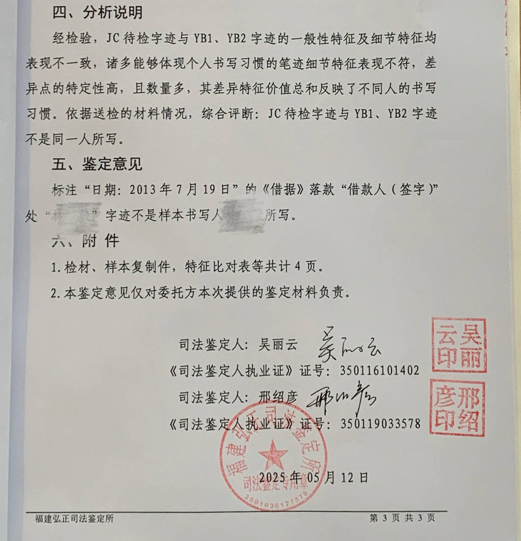 5月12日,福建弘正司法鉴定所出具两份司法鉴定意见书。其中文书鉴定的最终鉴定意见为“《借据》落款‘借款人(签字)’处‘林惇’字迹不是样本书写人林惇所写”。