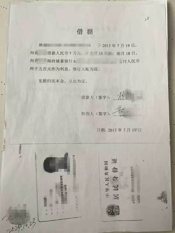 黄成钧则向澎湃新闻表示,黄晖的父亲是其多年好友,2013年黄晖愿担任担保人,且林惇提供了身份证复印件。黄成钧称,尽管与林惇并不认识,但因有熟人作保,且对方提供了身份信息,才同意借出这笔钱。他还提到,10万元借款以现金形式交付,由林惇与黄晖当面取走,利息最初由黄晖代为转交,自2015年起停止支付。