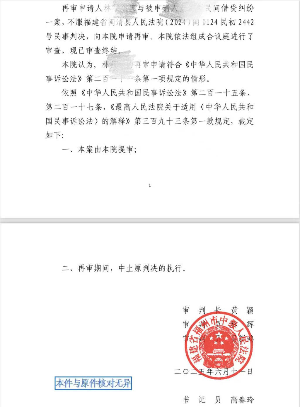 6月11日,福州市中级人民法院作出民事裁定书,该再审申请符合《民事诉讼法》第二百一十一条第一项“有新的证据,足以推翻原判决、裁定”的规定,作出“本案由本院提审”“再审期间,中止原判决的执行”的裁定。