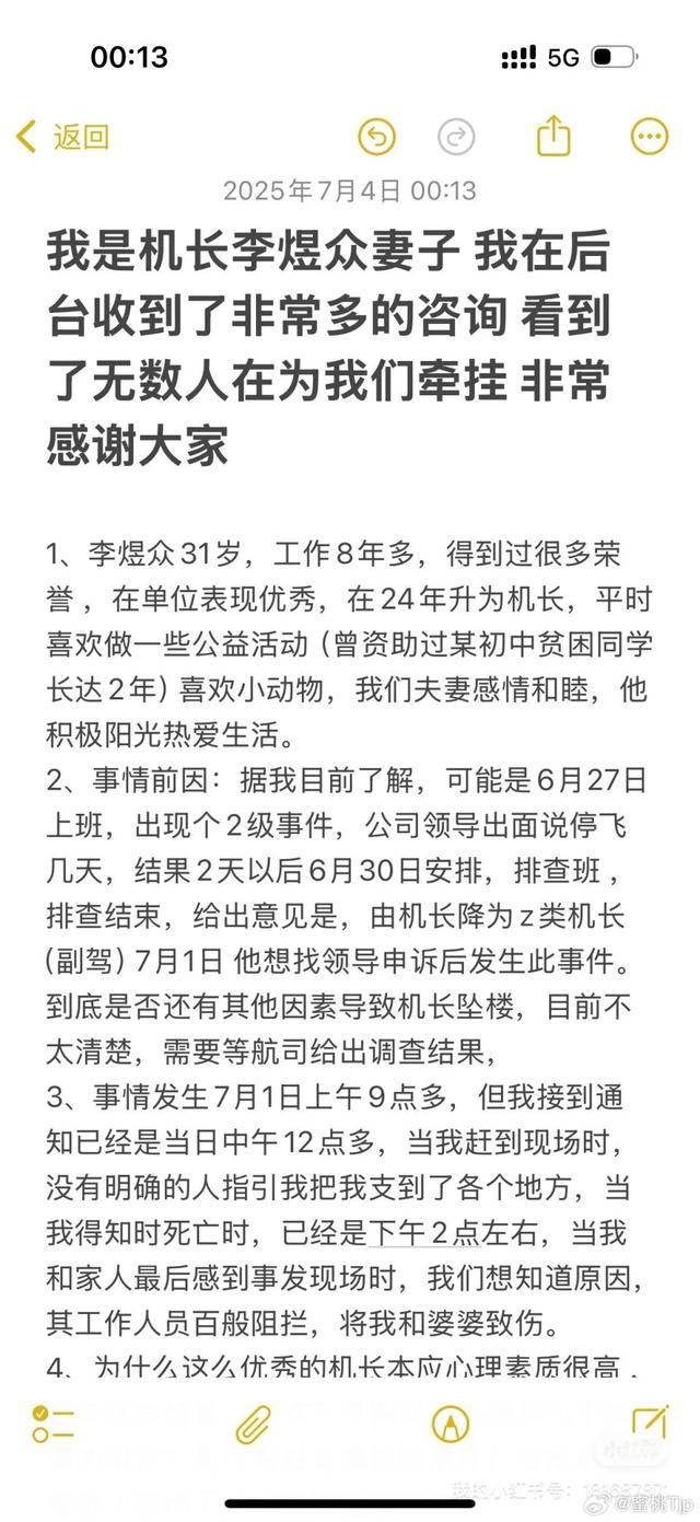 7月4日,李某妻子@蜜桃Tjp 发声:丈夫出事后南航无任何人通知家属,一个工作近10年的飞行员,工作期间得过很多奖,为何会突然身亡,他在公司遭受了什么不公待遇,自己要了解真相。