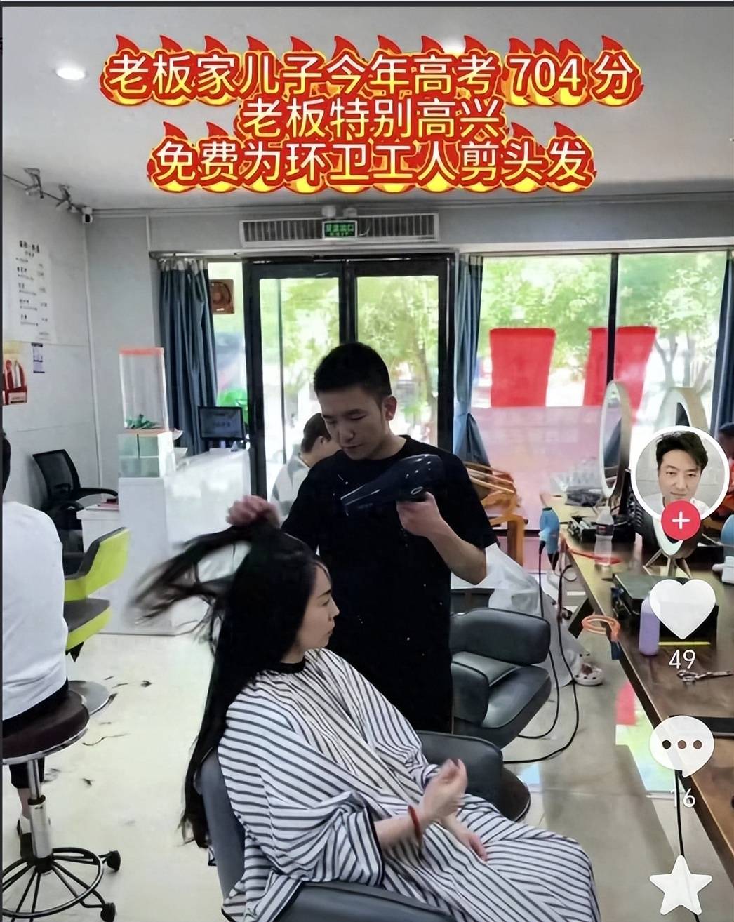 从7月初开始,男子在理发店门口挂起了一块醒目的红布帘,上面写着“为环卫工免费理发一个月”。消息传开后,前来理发的环卫工人们络绎不绝。店里每天都排着长长的队伍,大家都对男子竖起了大拇指。