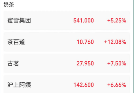 受到大量订单的刺激,7月7日,茶饮股全线高开,茶百道(02555.HK)一度大涨15%。截至发稿,茶百道涨12.08%,奈雪的茶(02150.HK)涨4.61%,古茗(01364.HK)涨7.50%,沪上阿姨(02589.HK)涨6.66%,蜜雪集团(02097.HK)涨5.25%。