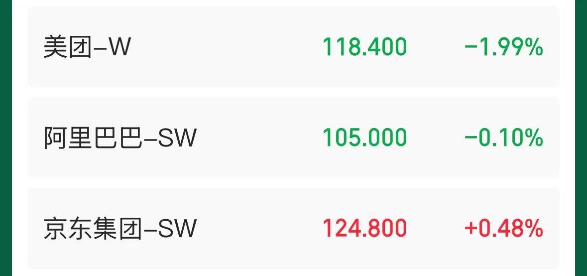 外卖平台股价则表现平平,美团(03690.HK)、阿里巴巴(09988.HK)、京东集团(09618.HK)股价一度齐跌。截至发稿,美团跌1.99%,阿里巴巴跌0.10%,京东集团涨0.48%。