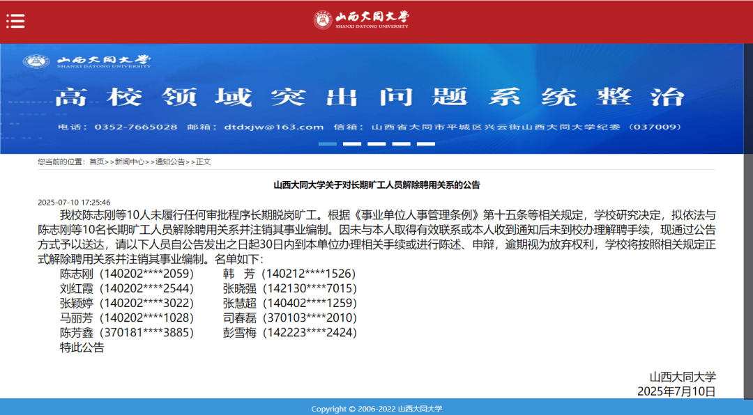 7月10日,山西大同大学发布“关于对长期旷工人员解除聘用关系的公告”: