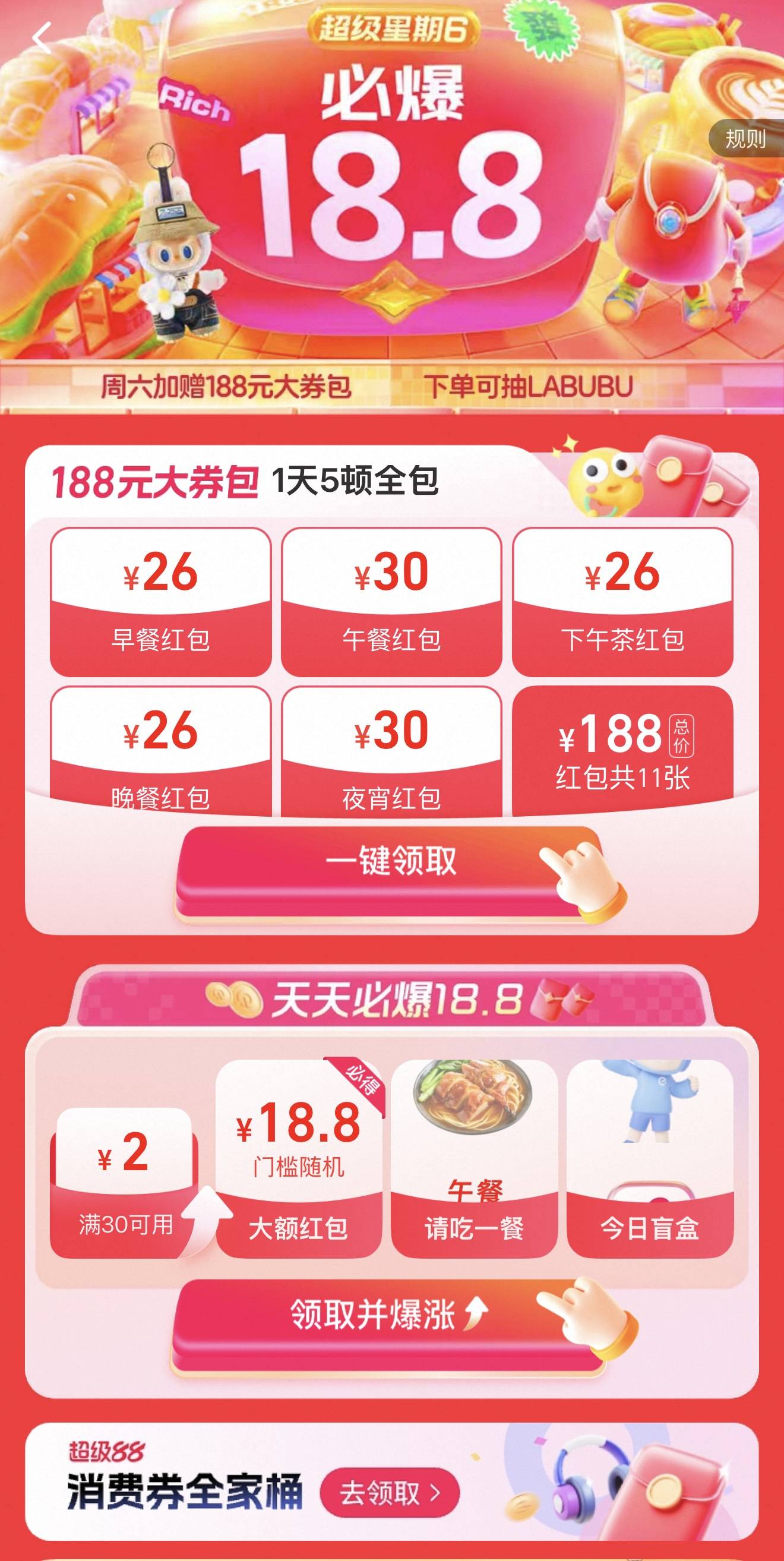 7月19日一早,点开外卖平台的孙琦,就接连收获“大礼”:美团发来了零元奶茶、早餐的兑换券,而淘宝闪购发来了一套188元的优惠券包,并宣传称“1天5顿全包”!“一天吃五顿,把消费者照顾的跟坐月子似的,还挺受用。”孙琦美滋滋的表示。