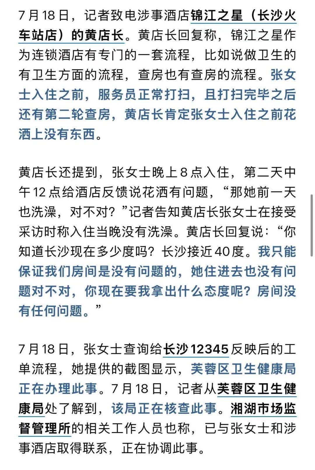 7月18日,张女士(化姓)向媒体爆料称,她在湖南长沙,入住连锁酒店锦江之星,沐浴后发现淋浴花洒头处有粪便。记者了解到,目前,长沙当地的卫健部门、市场监督管理部门均已介入调查此事。