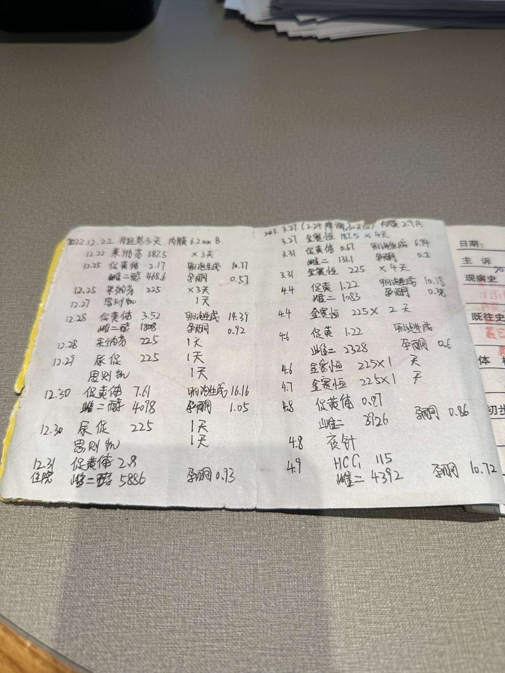 李云取过两次卵,第二次是在同年4月,她在本子上记录着每一颗卵泡的大小。第一次取了八颗,第二次卵泡全长起来了,取了十九颗。第二次取卵之后,腹部像喝了一桶水一样胀。她又住院五天,输消炎水,担心取卵之后的后遗症。