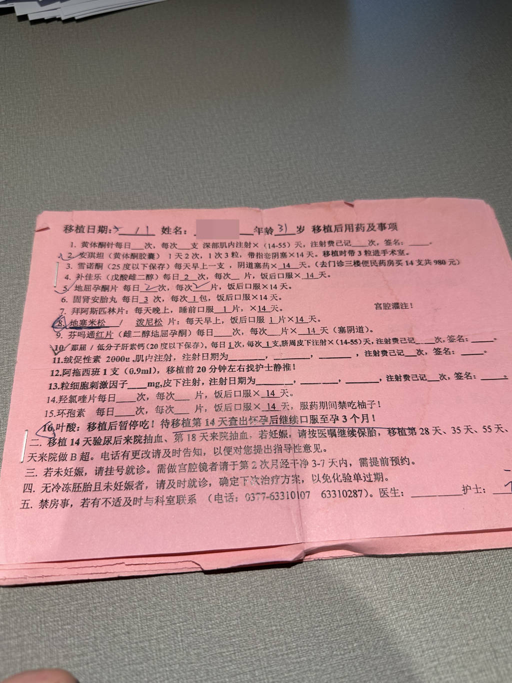 之后,她踏上试管移植之路,在南阳市第一人民医院取卵,然后移植胚胎。