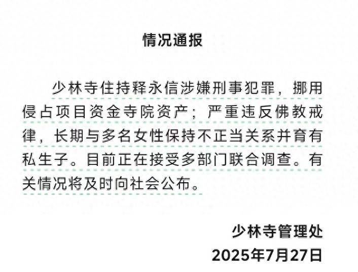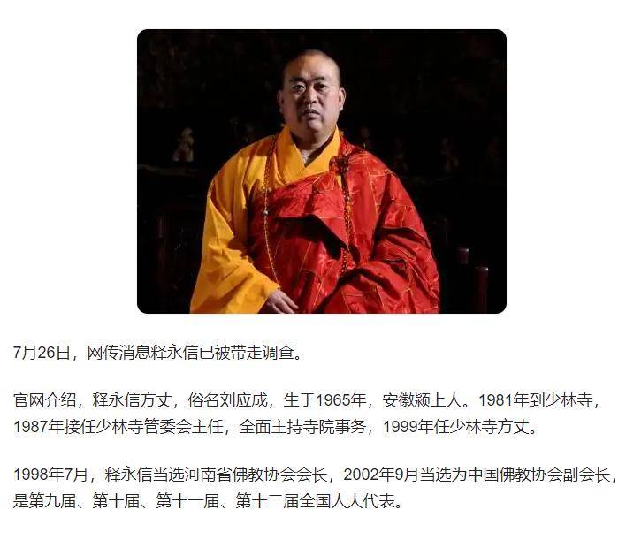 近日,关于“少林寺释永信被带走调查”的消息,相信大家都有所关注。根据7月27日晚上,少林寺官方通报的情况来看,他涉嫌刑事犯罪、育有私生子,当看到这则通报之后,不少人对此都感到十分震惊。