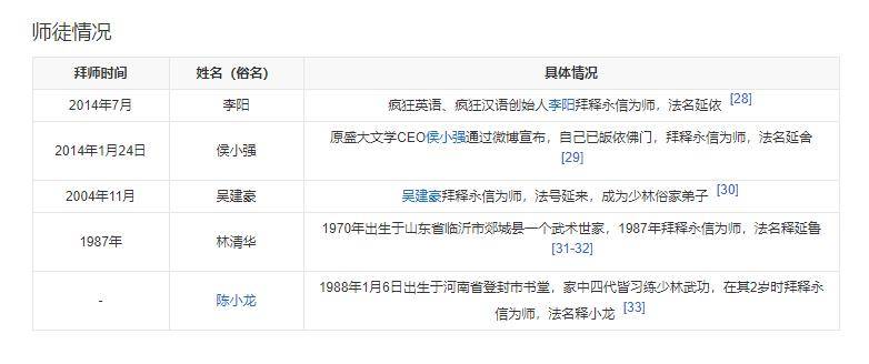 李阳、侯小强、吴建豪、林清华(法名释延鲁)、陈小龙(法名释小龙)。值得注意的是,2015年7月30日,少林寺多名弟子表示:“释延鲁早已经被迁单还俗”。