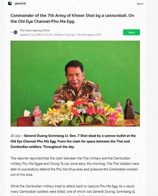 当地时间7月24日,泰国军方发布了一则重磅公告:在持续数日的交火中,泰军通过一次空袭行动,击毙了柬埔寨高棉第7集团军司令杜昂·索姆南中将。