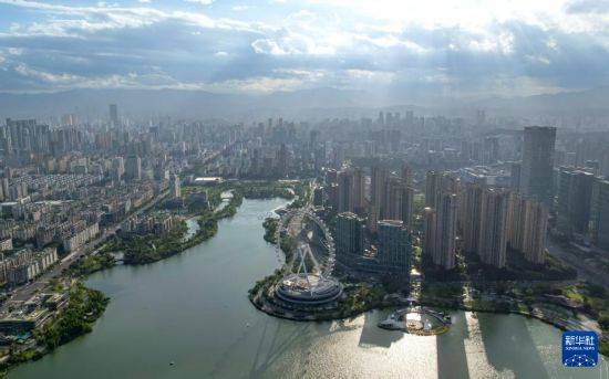 福州西湖-左海湿地公园沿岸城市风光(8月1日摄,无人机照片 )。