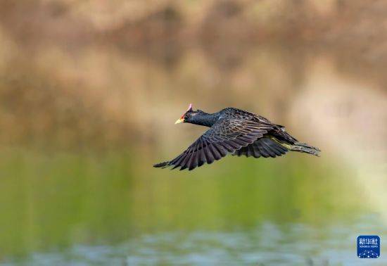 在福州连江县山堂村,一只董鸡在水田上空飞行(7月30日摄)。