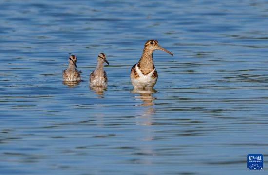 在福州连江县山堂村,彩鹬在水田里觅食(7月30日摄)。