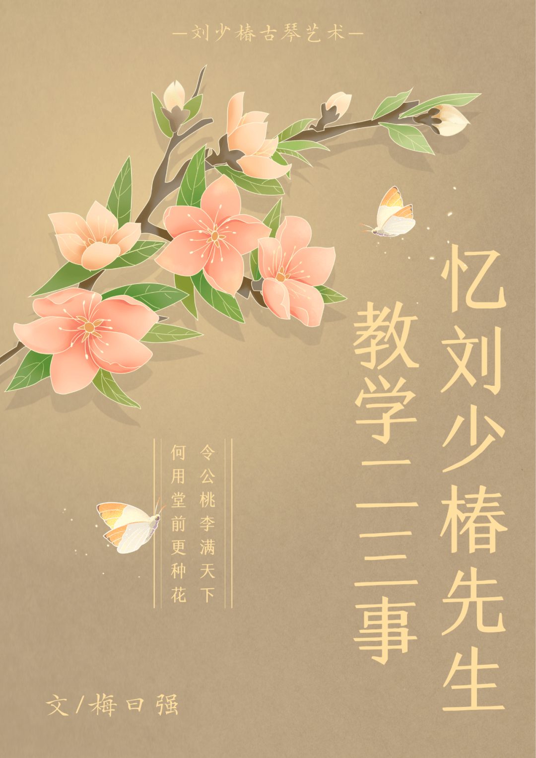 一九五六年初秋的夜晚我与大师兄张正吟,二师兄邓文权在南京大行宫一个普通的旅社里,拜见了应文化部艺术研究院音乐研究所、对全国琴人普查,邀请来南京录音的两位扬州琴人刘少椿先生、胥桐华女士。琴人见面不外乎“以琴会友”。聆听二老操琴后,我们十分吃惊,刘少椿先生不论是在操缦气度上,还是在“运指神奇、音韵沉静、跌宕自然”上,均使我们“坐井琴蛙”觉得新奇、钦服。事后,经张正吟奔走,在市文化局的大力支持下,得以将先生留在南京乐社教学,使我能从刘先生学习广陵琴派艺术。