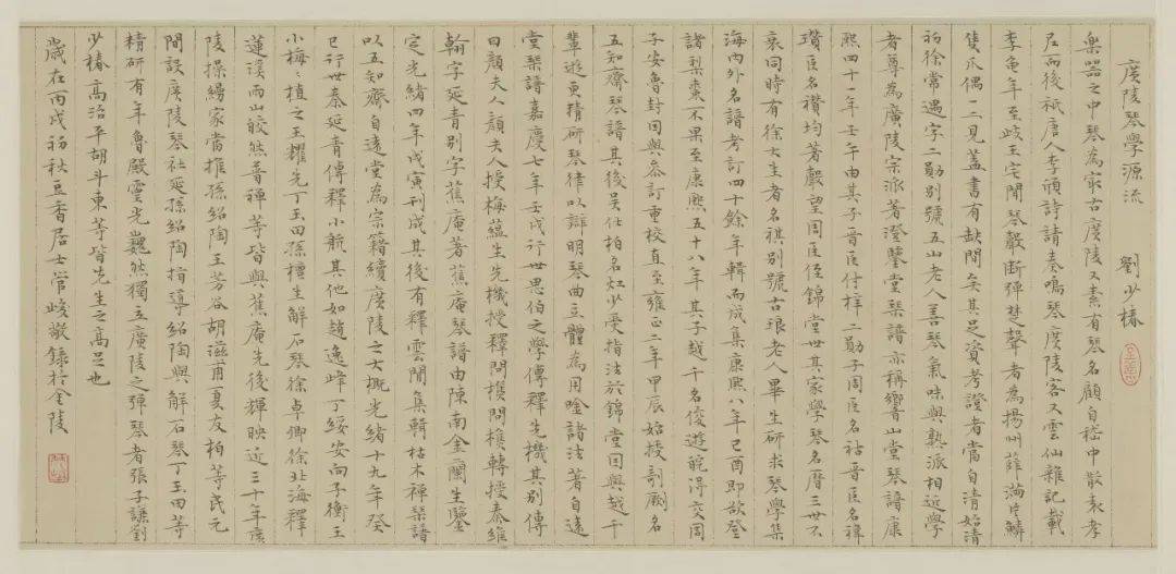 同时有徐大生者,名祺,别号古琅老人,毕生研求琴学,集海内外名谱,考订四十余年,辑而成集。康熙八年己酉即欲登诸梨枣,不果,至康熙五十八年,其子越千名俊,游皖得交周子安鲁封,因与参订重校,直至雍正二年甲辰(民前一八八年),始授剞劂,名《五知斋琴谱》。