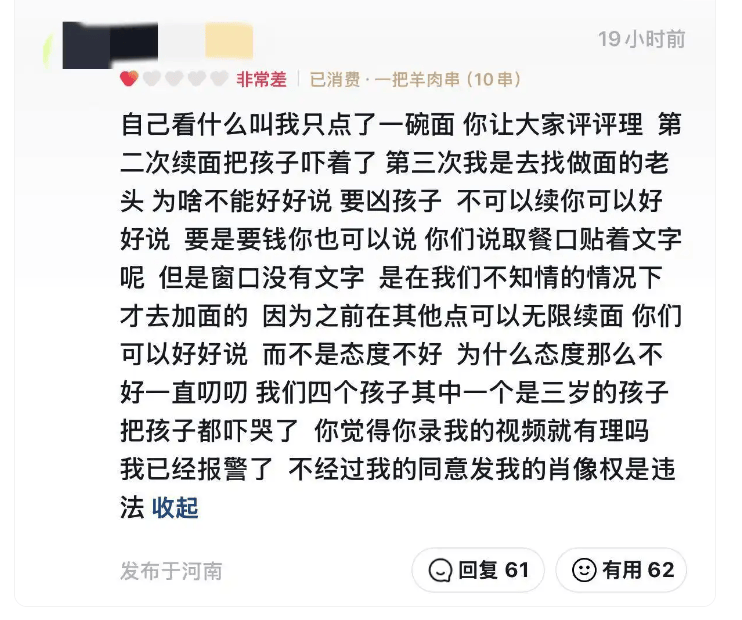 15日上午,红星新闻查看霍先生所开面店在社交平台上的评价时发现,此前涉事顾客所发布的差评仍在,上面评论的内容为:“什么叫我只点了一碗面,你让大家评评理,第二次续面把孩子吓着了,第三次我是去找做面的老头,为啥不能好好说?要凶孩子,不可以续你可以好好说。要是要钱你也可以说,你们说取餐口贴着文字呢。但是窗口没有文字,是在我们不知情的情况下才去加面的,因为之前在其他店可以无限续面……”