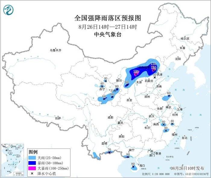 预计,8月26日14时至27日14时,内蒙古中南部、青海东南部、甘肃中南部、宁夏南部、陕西北部、山西北部、河北中北部、北京、天津西北部以及江淮南部、江南东部等地部分地区有大到暴雨,其中,内蒙古河套地区、陕西北部、山西西北部、河北中北部、北京西部等地部分地区有大暴雨(100~180毫米)。上述部分地区伴有短时强降水(最大小时降雨量20~50毫米,局地可超过80毫米),局地有雷暴大风等强对流天气。