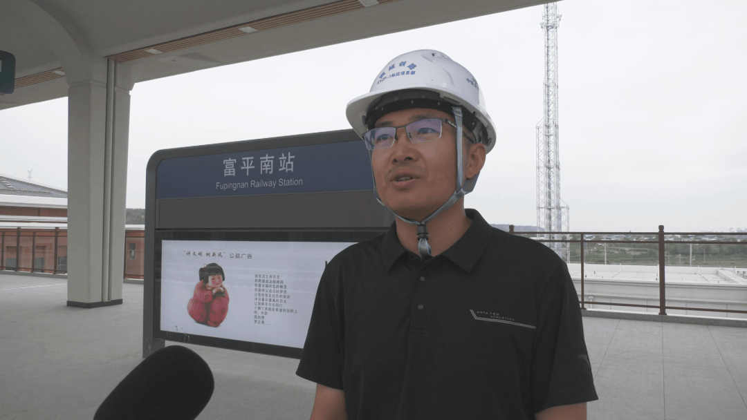 中铁北京工程局集团西延铁路站房1标项目党支部书记 纪海波:富平南站站房建筑面积约6000平方米,站场规模达2台4线。该站以“关中名邑•富庶太平”为设计理念,将平缓舒展的屋面与进退错落的立面结合,表达庄重大气的建筑形态,营造具有纵深感的建筑空间。