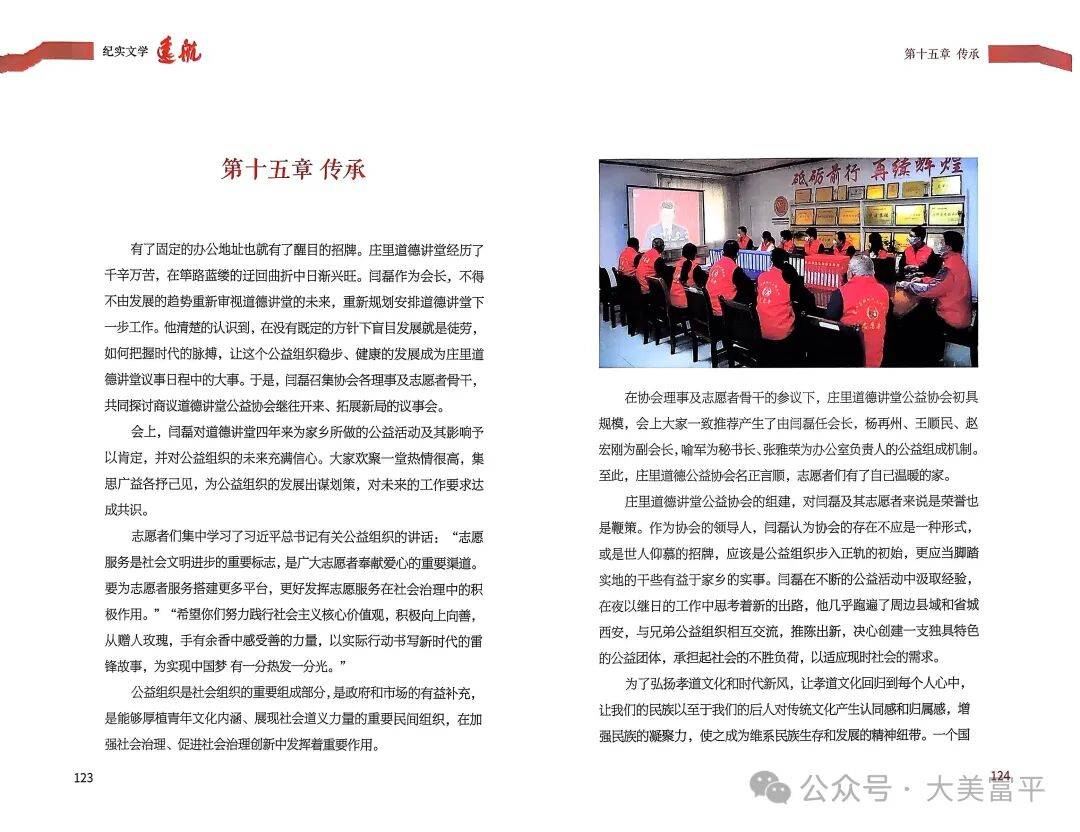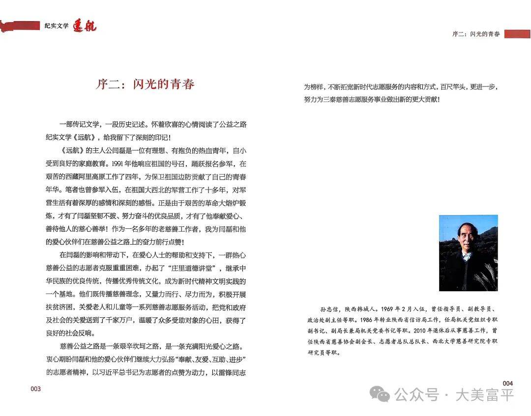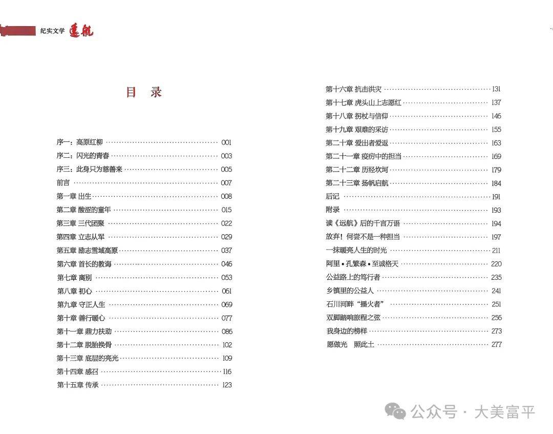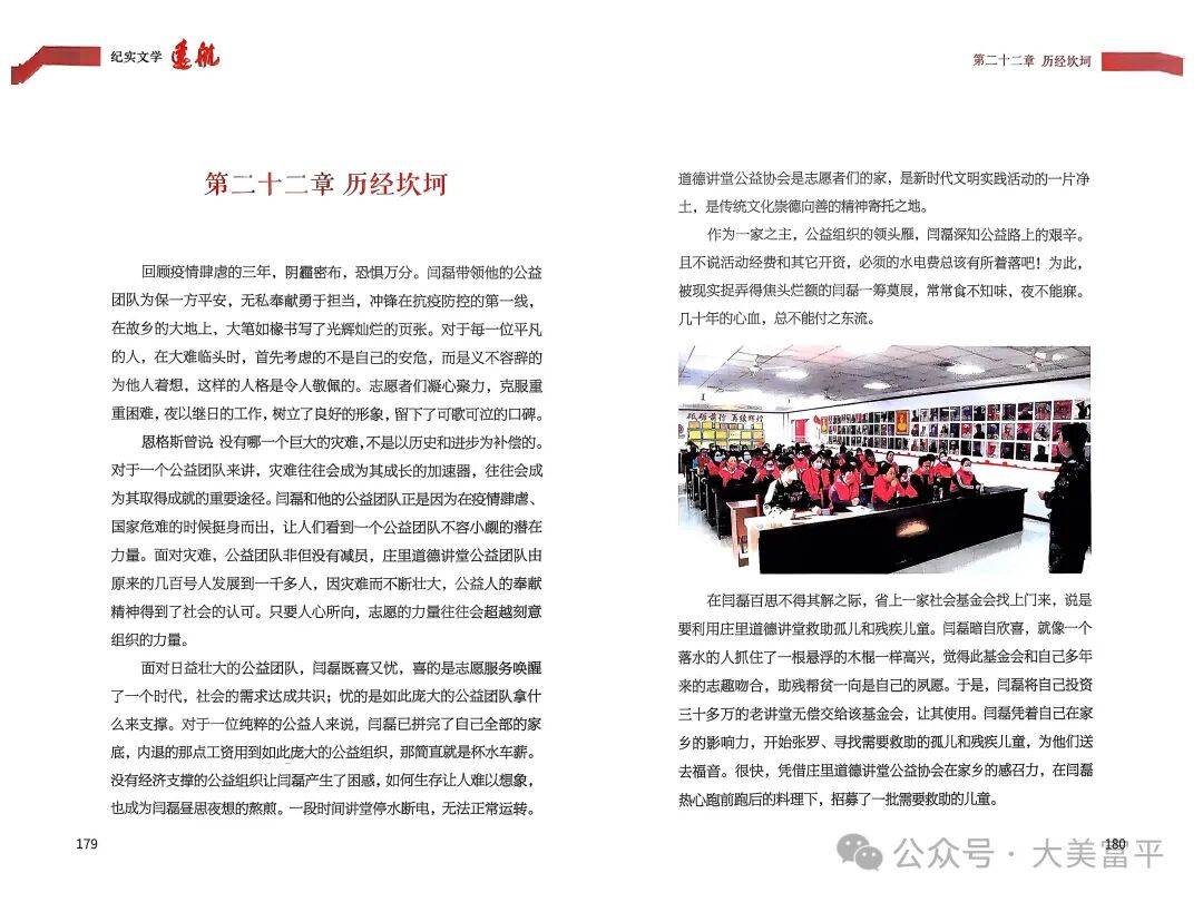 长篇纪实文学《远航》是一部完整、全面而生动书写社会慈善公益志愿者的纪实文学佳作。作品以普通人的视角,生动真实地记录了一个民间自发的志愿者团体从最初的数十几人逐渐发展壮大至上千人,成员涵盖了教师、医生、退役军人、农民和学生等多个群体。在退役军人闫磊的带领下,他们齐心协力、克服万难,积极投身于扶贫济困、开办道德讲堂、家风文明建设、关爱老人儿童、参与抗洪抢险、赓续红色文化等公益志愿服务活动,深刻反映了当前社会公益组织的真实状况和志愿者们在志愿服务中的艰辛以及成长历程。