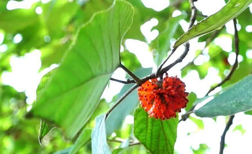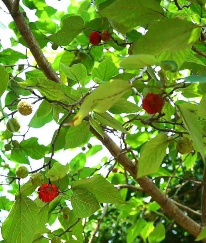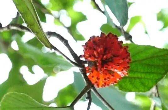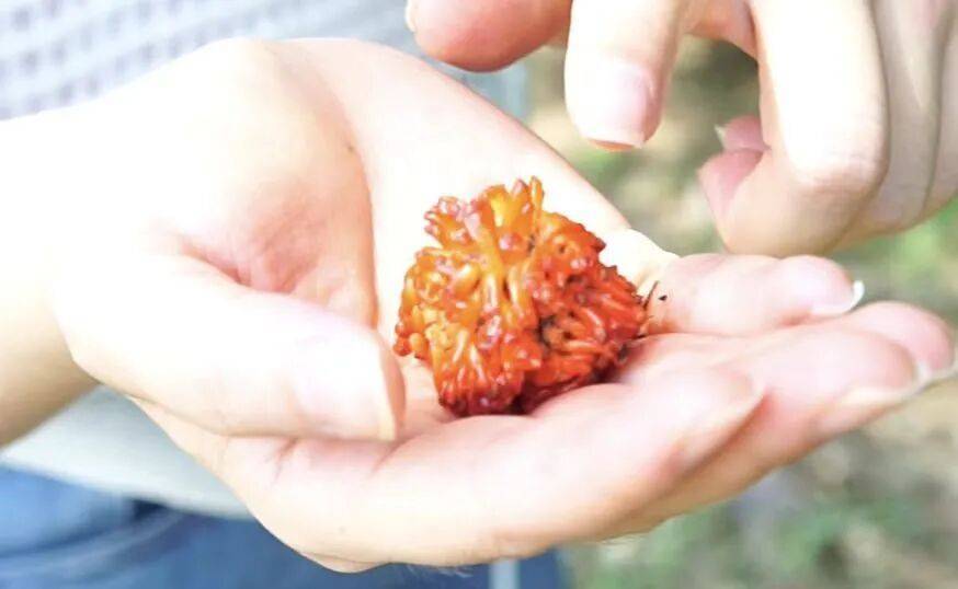这一个个红色果实肥嘟嘟的,像绣球一般,显得十分可爱。“来尝一口。”在专业人士的指导下,记者尝了一口,果实顿时在口中爆开。“很甜,汁水也很多。”此时,记者的手上也染上了红色的“染料”。可以看到,果肉上端还有一粒黑色的籽,那就是构树的种子。“汁多味甜,怪不得鸟儿们爱吃呢。”