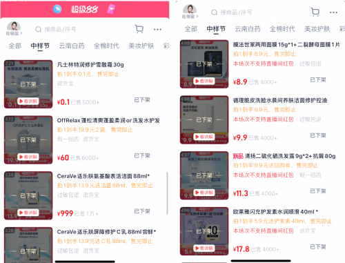 据观察,本次中样节上线产品涵盖护肤、彩妆、香氛等多个品类,包括精华、面霜、粉底液等热门单品。直播期间,多个品牌的中样产品上架即秒罄,部分品牌临时补货多次。消费者对中样产品的热情,展现出市场对“体验式消费”的强烈需求。