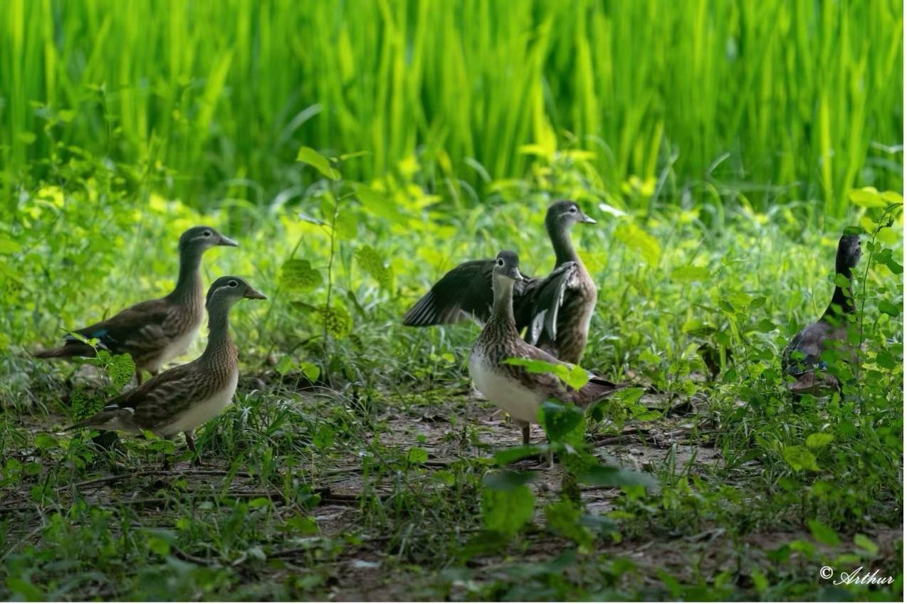鸳鸯幼鸟成群结队地啄食草叶。通讯员 彭涛 摄