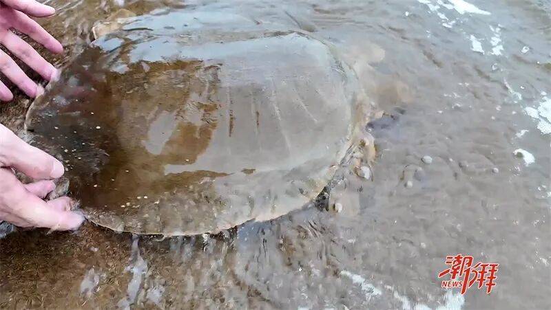 据了解,9月16日晚,潮州市渔民在韩江市区段收网时,发现网中有一只形似“大甲鱼”的生物,与潮州市海综支队微信公众号所宣传的韩江鼋(yuán)非常相似。