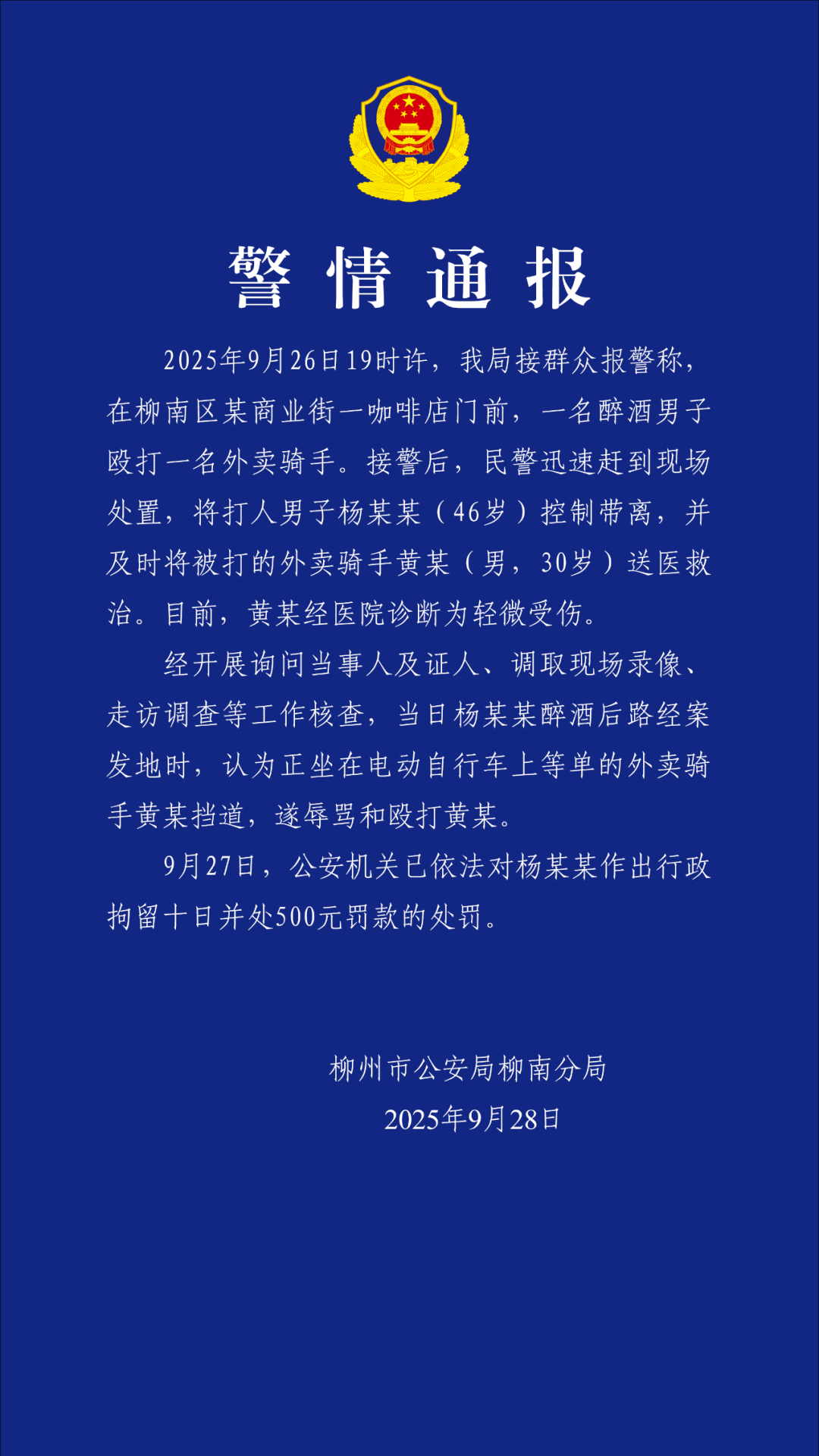 2025年9月26日19时许,我局接群众报警称,在柳南区某商业街一咖啡店门前,一名醉酒男子殴打一名外卖骑手。接警后,民警迅速赶到现场处置,将打人男子杨某某(46岁)控制带离,并及时将被打的外卖骑手黄某(男,30岁)送医救治。目前,黄某经医院诊断为轻微受伤。