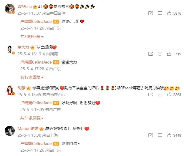 此外,Ella陈嘉桦、董力、阿诺、胡静等人也纷纷留言祝福卢靖姗与韩庚再次升级当爸妈!