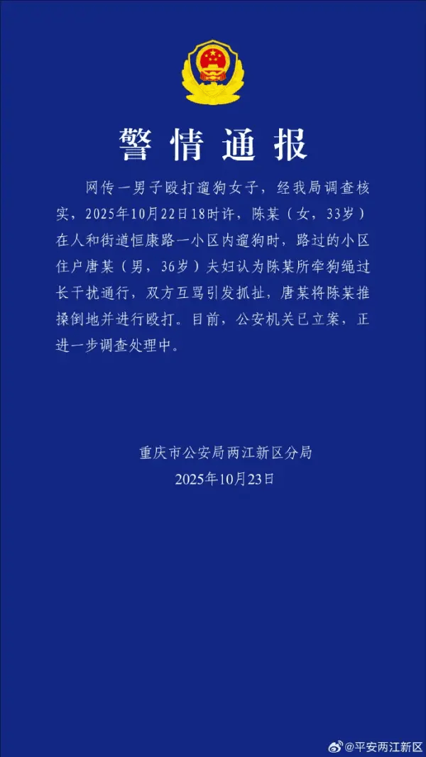 10月23日,重庆市公安局两江新区分局微博发布警情通报:网传一男子殴打遛狗女子,经调查核实,10月22日18时许,陈某(女,33岁)在人和街道恒康路一小区内遛狗时,路过的小区住户唐某(男,36岁)夫妇认为陈某所牵狗绳过长干扰通行,双方互骂引发抓扯,唐某将陈某推搡倒地并进行殴打。目前,公安机关已立案,正进一步调查处理中。