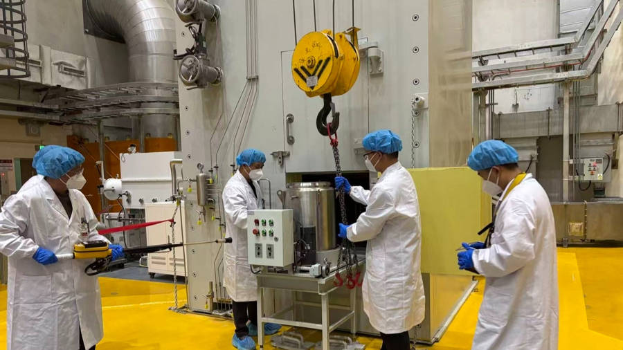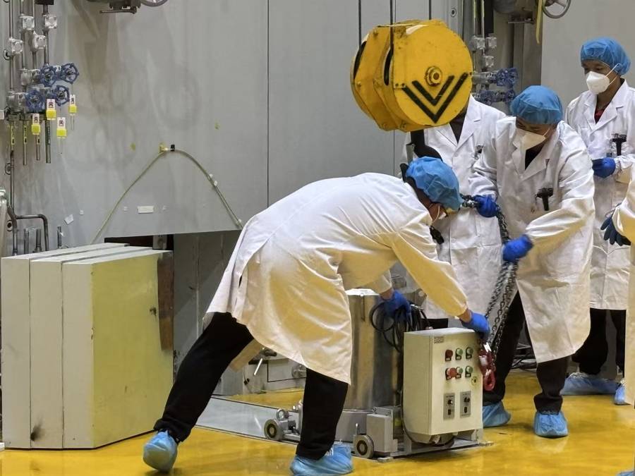 科研人员将熔盐堆中取出的样品传送到相关实验室