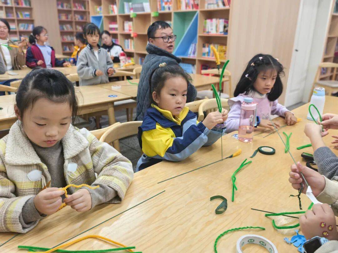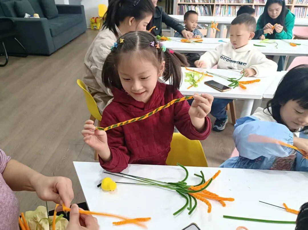 延伸活动,志愿者和家长一起指导协助孩子们制作了“扭扭棒麦穗花束”。孩子们用稚嫩的手指小心翼翼地卷曲、粘贴,金黄的扭扭棒被组合成一份份饱满的麦穗,正如卜式捐粮之举,将一束束沉甸甸的“收获”献给祖国,是萌芽中的责任与爱。