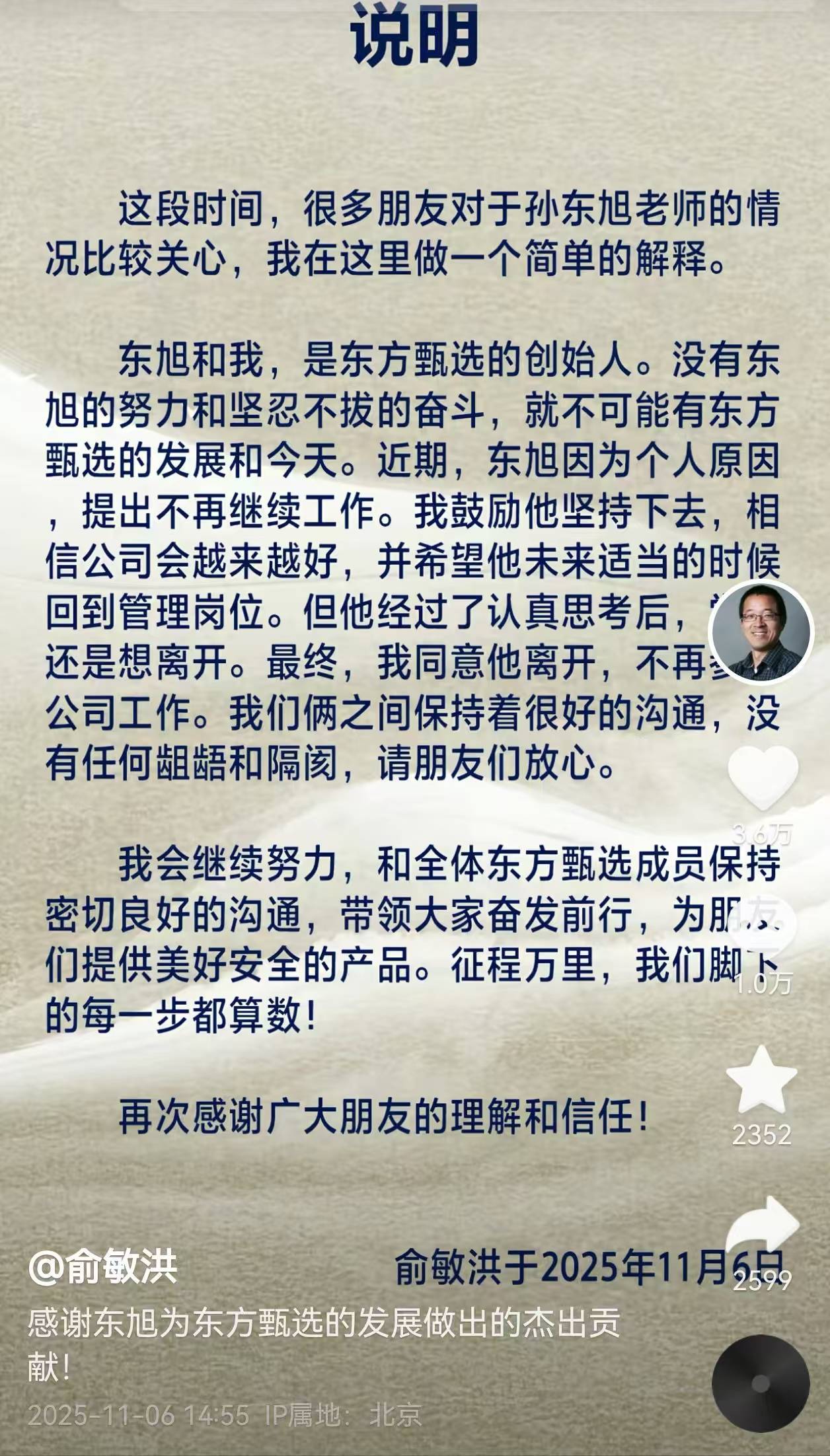 11月6日,俞敏洪在社交平台发文称,孙东旭已从东方甄选离职。
