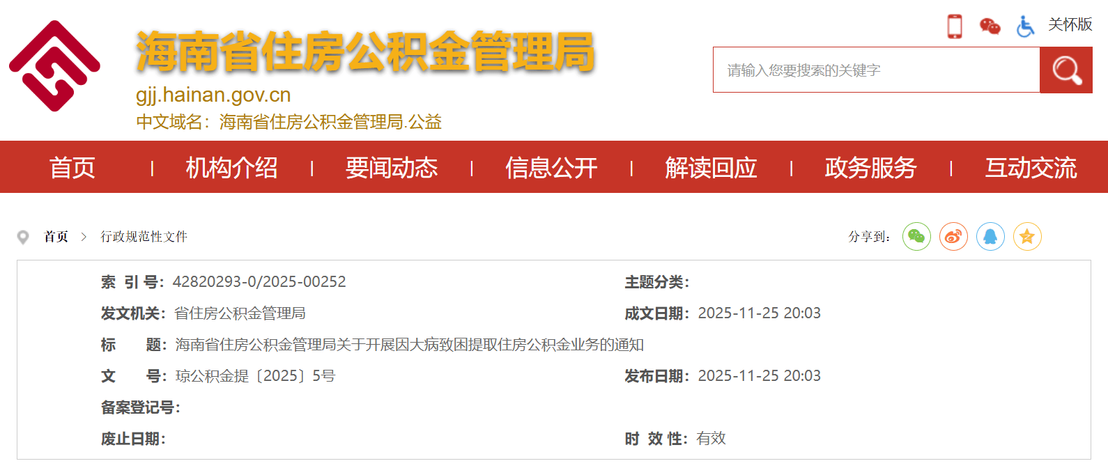据海南省住房公积金管理局官网消息,11月25日,海南省住房公积金管理局发布关于开展因大病致困提取住房公积金业务的通知: