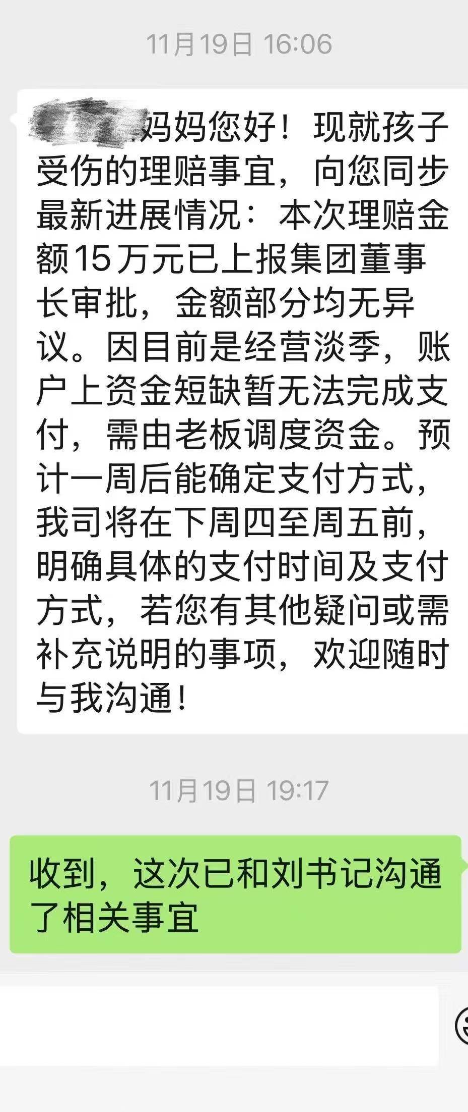 “11月18日,有相关部门给我打电话说解决这件事。去了之后园区不想谈责任问题,只谈赔偿,表示愿意给15万元赔偿,让我们给一周时间确认支付方式,我们同意了。”11月19日,该企业一名员工给陈女士发送微信,该员工称:就孩子受伤的理赔事宜,向您同步最新进展情况:本次理赔金额15万元已上报集团董事长审批,金额部分均无异议。因目前是经营淡季,账户上资金短缺暂无法完成支付,需由老板调度资金。预计一周后能确定支付方式,我司将在下周四至周五前明确具体的支付时间及支付方式。陈女士回复:收到,这次已和刘书记(当地街道书记)沟通了相关事宜。