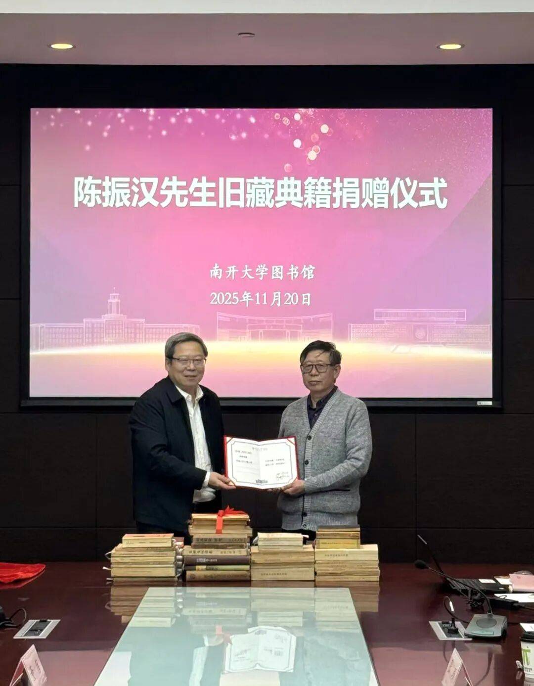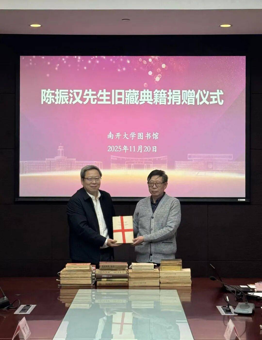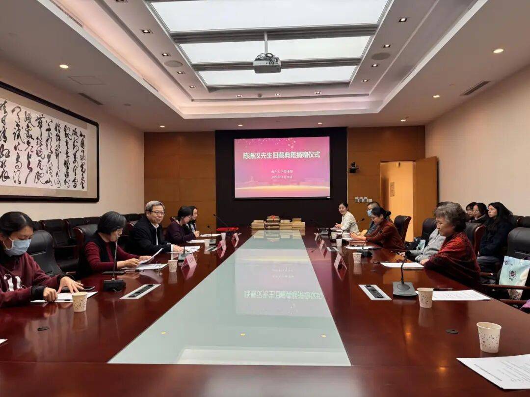 11月20日,陈振汉先生旧藏典籍捐赠仪式在南开大学津南校区中心馆举行。陈振汉先生亲属代表陈叔和先生、赵建平女士向南开大学图书馆捐赠图书,图书馆馆长韩召颖出席仪式并致辞,图书馆馆长助理董蓓、经济学院张玮老师及图书馆馆员、师生代表参加仪式。仪式由图书馆古籍特藏部主任惠清楼主持。