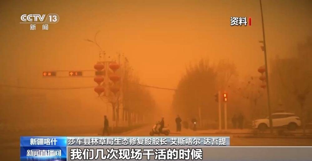 新疆喀什莎车县林草局生态修复股股长 艾斯喀尔·达吾提:天整个就变黄了,我们几次现场干活的时候就被风给吞噬了,跑都来不及跑。