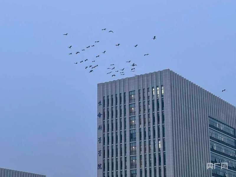 央广网芜湖11月29日消息(记者徐秋韵)近日,47只国家一级保护动物、有着“鸟中大熊猫”之称的东方白鹳,编队掠过安徽师范大学生命科学学院清源楼上空,低空盘旋的身影被恰好路过的该院副教授陈潘拍下。