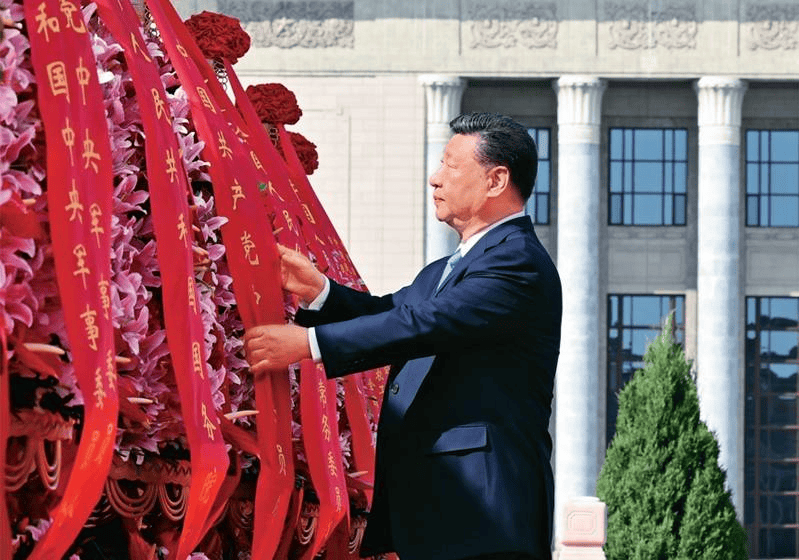 2025年9月30日上午,党和国家领导人习近平、李强、赵乐际、王沪宁、蔡奇、丁薛祥、李希、韩正等来到北京天安门广场,出席烈士纪念日向人民英雄敬献花篮仪式。这是习近平整理花篮上的缎带。 新华社记者 李响/摄