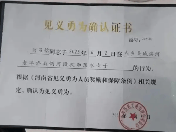 据新闻坊、上游新闻等媒体此前报道,今年6月2日凌晨,河南南阳16岁少年时习铭因施救溺水女子而不幸离世,该女子成功获救。6月12日,南阳市内乡县见义勇为基金会向其家属颁发了见义勇为确认证书 。