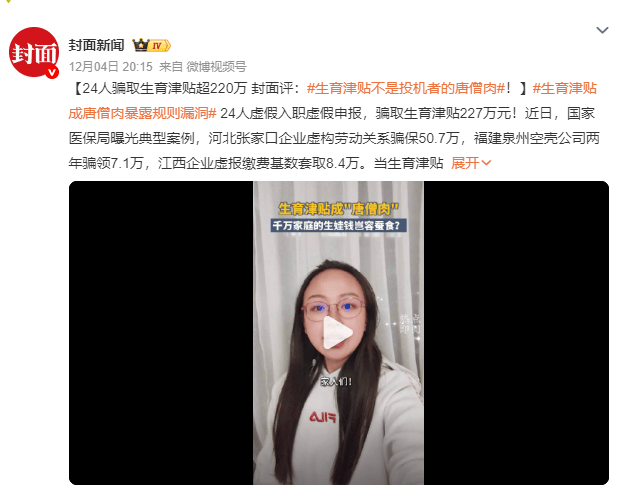 24人虚假入职虚假申报,骗取生育津贴227万元!近日,国家医保局曝光典型案例,河北张家口企业虚构劳动关系骗保50.7万,福建泉州空壳公司两年骗领7.1万,江西企业虚报缴费基数套取8.4万。当生育津贴沦为“提款机”,受伤的是千万个普通家庭的生育尊严。生育津贴不是能“薅羊毛”的唐僧肉,而是国家托举生育希望的“生命基金”。