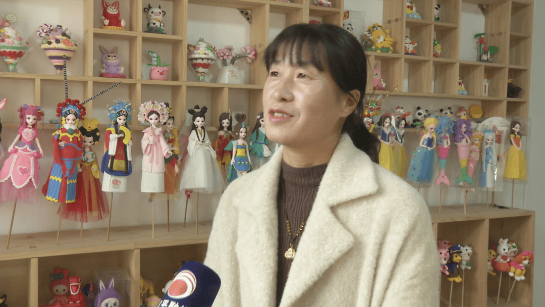 面塑技艺传承人 黄养娟:我个人比较喜欢古装的侍女,喜欢她那服饰、头饰,有时候还要看一些资料,来做这个发型是什么发型,古代清代的发髻,上头做一个旗头大拉翅,唐代女子衣衫,前面捏一个压襟,各种配饰都可以来做。再就是花鸟的,做花鸟叶子要擀得特别特别薄一点,像薄如蝉翼,做出来的花瓣比较仿真一点,做得太厚的话就不好看了,不真实了。卡通小动物越圆润越胖越萌一点比较可爱点,小朋友们都喜欢这东西。