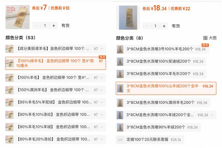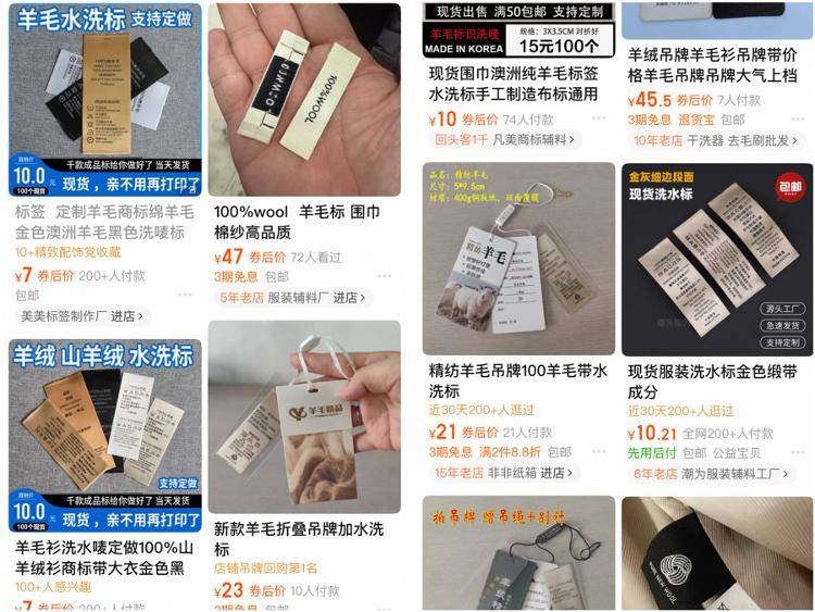 在电商平台,销售羊毛制品标签的商家比比皆是,价格相当便宜,不到1角钱就能买一个。