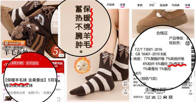 以一款品牌羊毛袜为例,商品名称是“保暖羊毛袜,含桑蚕丝”,并在“商品详情”图文并茂地介绍了羊毛的保暖性能。可记者浏览完商家洋洋洒洒的介绍后,终于在具体纤维成分表中查到,这款袜子的羊毛含量只有2%。