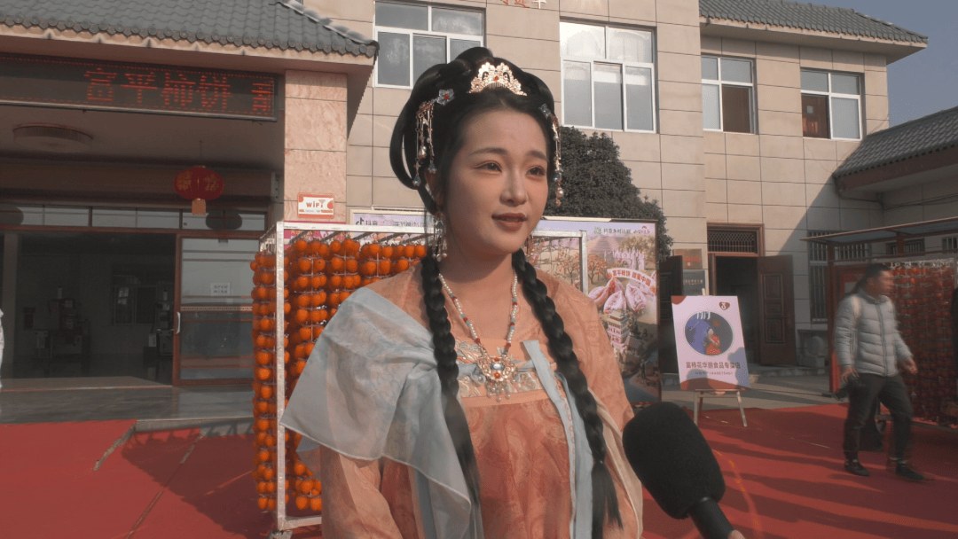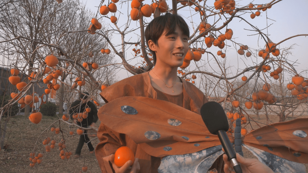 抖音达人 小麦肤色(张力天):非常的开心,也来到柿林,第一次来到这里,非常震撼,今天也换了柿染的服装,刚才在这里面也跳了一段舞蹈,也想用我舞蹈的力量宣传富平柿饼。