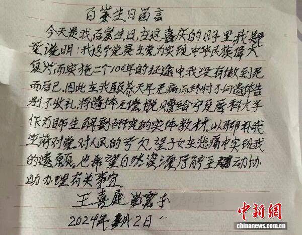 即便年岁渐高,王喜庭同志始终心系公益、胸怀大爱。在100岁生日这一特殊时刻,他郑重留下遗嘱,明确表达去世后捐献遗体供医学教学的意愿,叮嘱子女尽快联系宁夏红十字会办理相关手续。