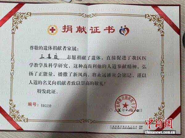 老人离世后,在宁夏红十字会的协调对接下,将其遗体顺利移交宁夏医科大学,用于医学人才培养与临床教学实践,为医学领域攻克难题、提升诊疗水平提供助力。王喜庭以另一种方式延续生命价值,让“奉献”二字在生命尽头绽放璀璨光芒。