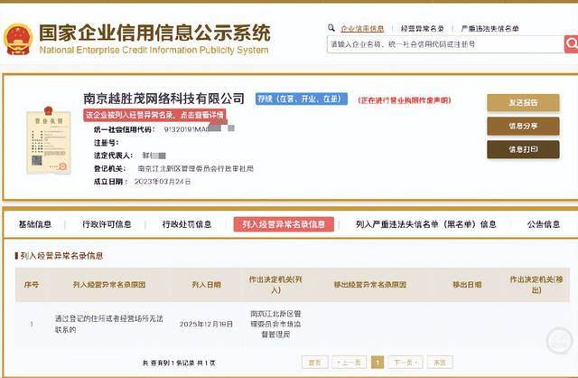 12月26日,上游新闻记者调查发现,涉事App开发公司已被市场监管部门列入经营异常名录。记者以市民身份致电该公司辖区南京江北新区管理委员会市场监督管理局问询,一名工作人员解释称,企业被列入经营异常,说明执法人员在注册地址无法找到该公司,且无法取得联系。“3500元借款10天需还4970元,明显涉嫌高利贷,建议向金融管理部门反映。”